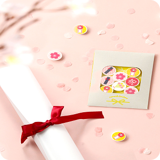 豊富な絵柄から選べるほか、2粒には校章や団体名、日付などをプリント可能です。